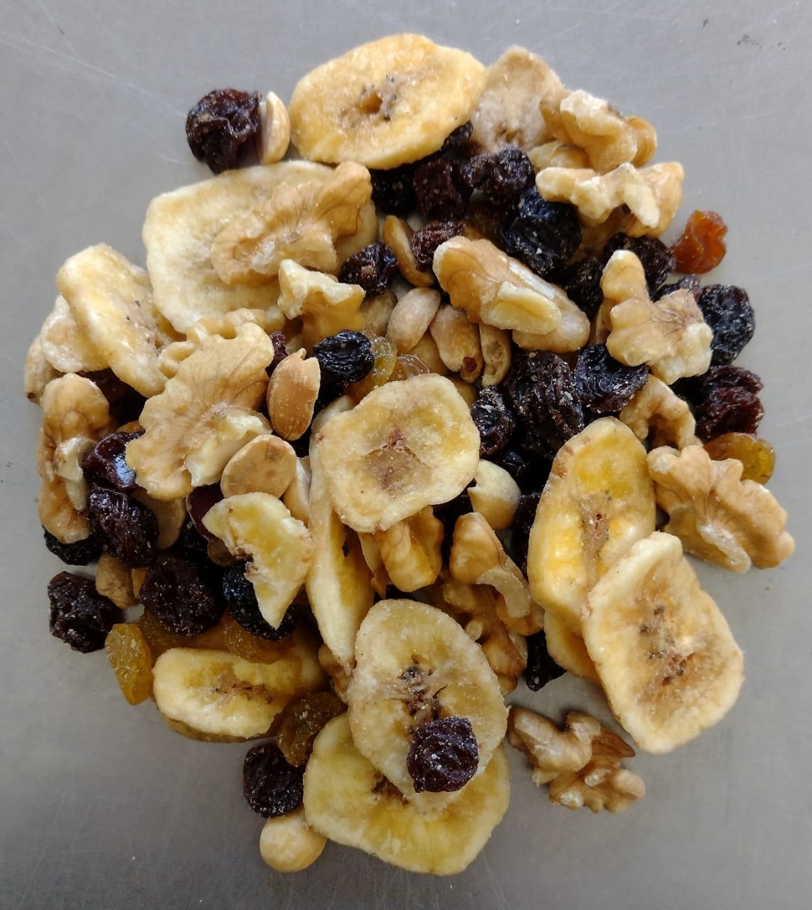 MIX GUERRERO : Maní, pasas de uva rubias (sin semilla), pasas de uva morochas (sin semilla), banana chip y Nuez mariposa blanca común