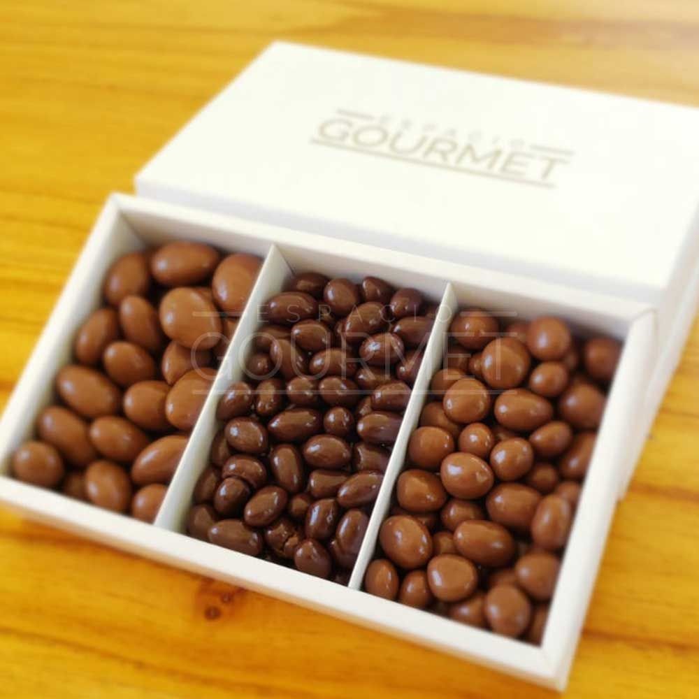 CONT: ALMENDRAS BAÑADAS EN CHOCOLATE CON LECHE 100 GR, PASAS DE UVA BAÑADAS EN CHOCOLATE CON LECHE 100 GR Y MANI BAÑADO EN CHOCOLATE SEMIAMARGO 100 GR.