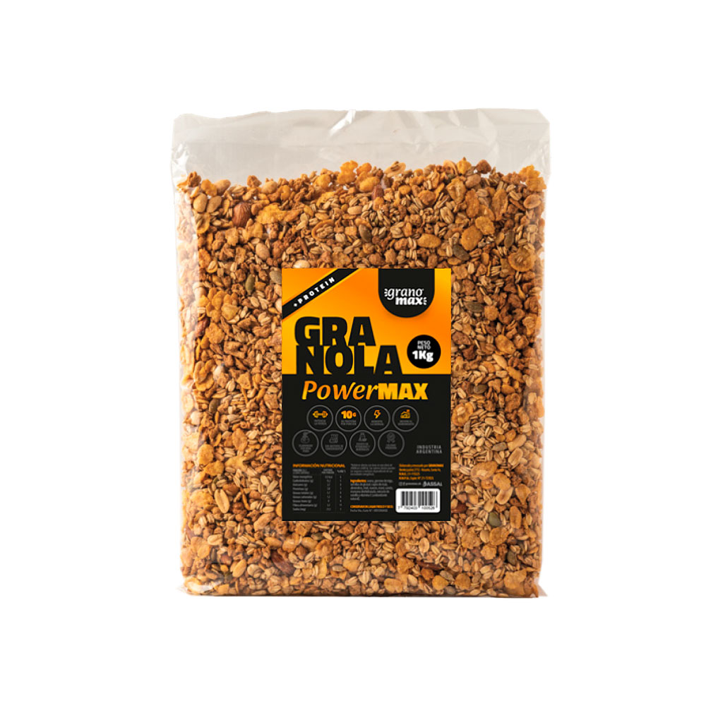 POWERMAX: avena, aislado de proteína de soja, albumina de huevo, almendras, nueces, copos de maíz sin azúcar, semillas de calabaza, semillas de girasol, maní, miel, extracto de vainilla y vitamina E (antioxidante natural).