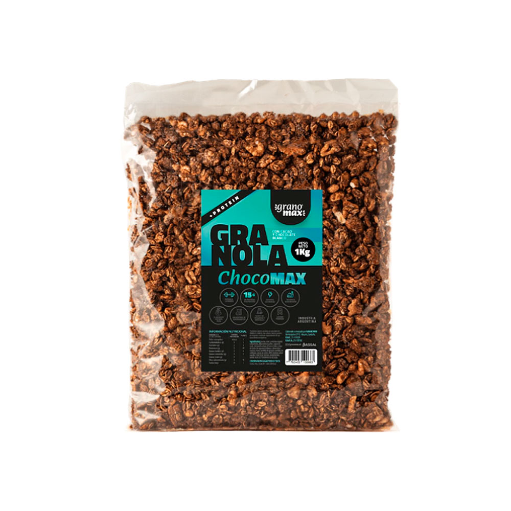 CHOCOMAX: avena, miel, proteina vegetal texturizada, albumina en polvo, copos de maiz, extrusado a base de arroz dulce, chips de baño de reposteria blanco, almendras, nueces, mani, semillas de girasol, semillas de calabaza, cacao en polvo, ARO: escencia sabor vainilla.